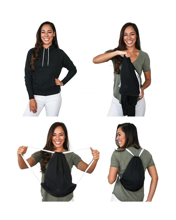 A hoodie that converts into a backpack! Yes, this is our second-most sold-out branded merch as it is unique and usable. This innovative garment seamlessly converts from a hoodie to a practical backpack in moments.